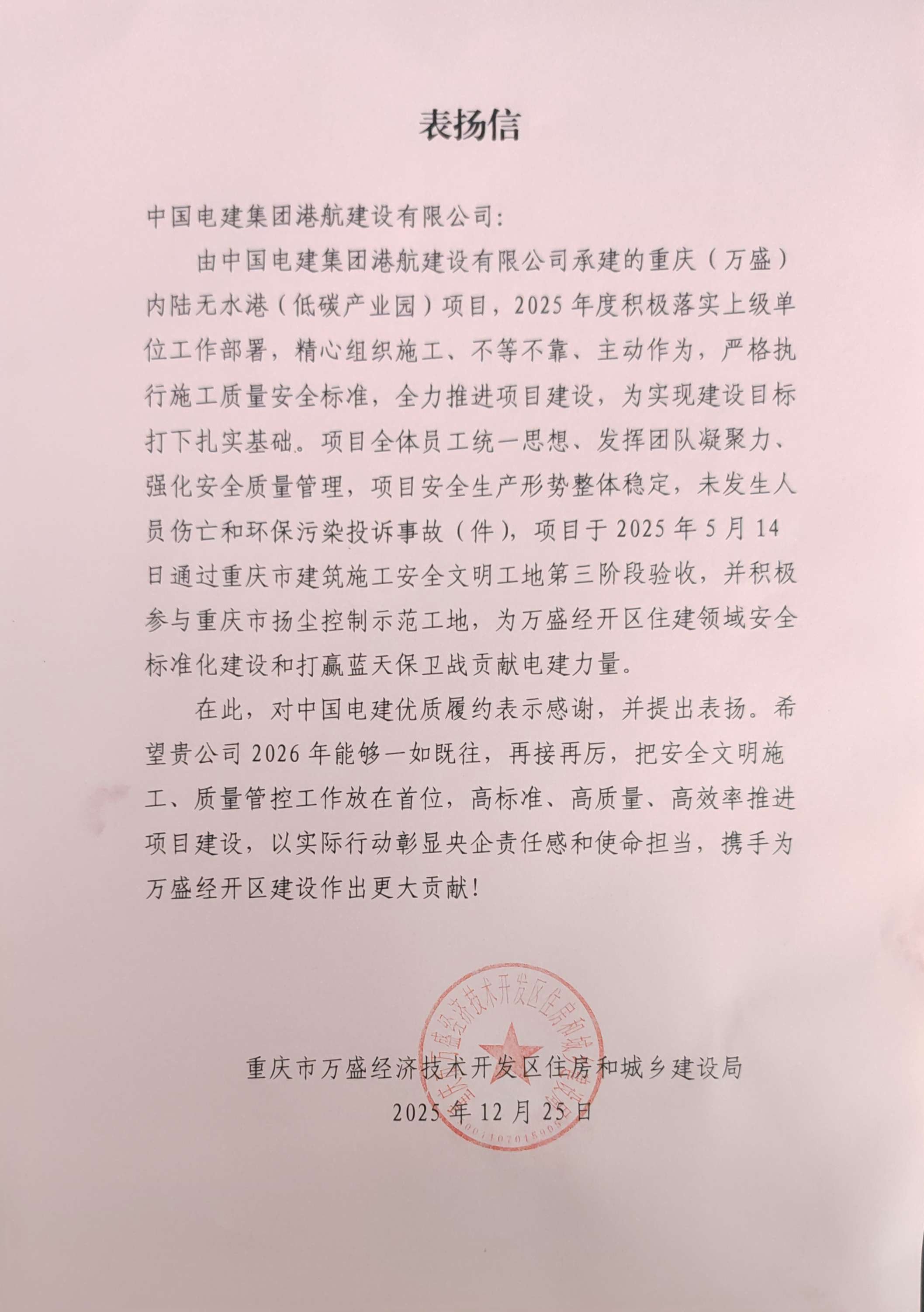 近日,重庆(万盛)内陆无水港(低碳产业园)项目部收到万盛经开区住房和城乡建设局发来的表扬信,信中对项目在安全生产、质量管控和文明施工等方面的表现予以肯定。