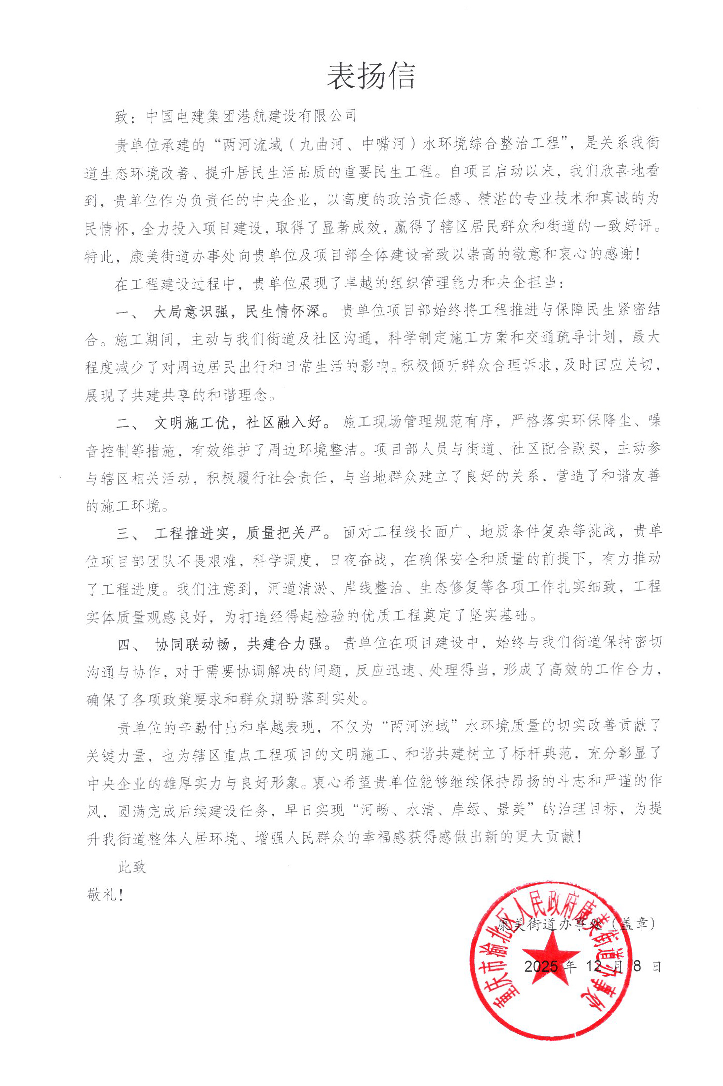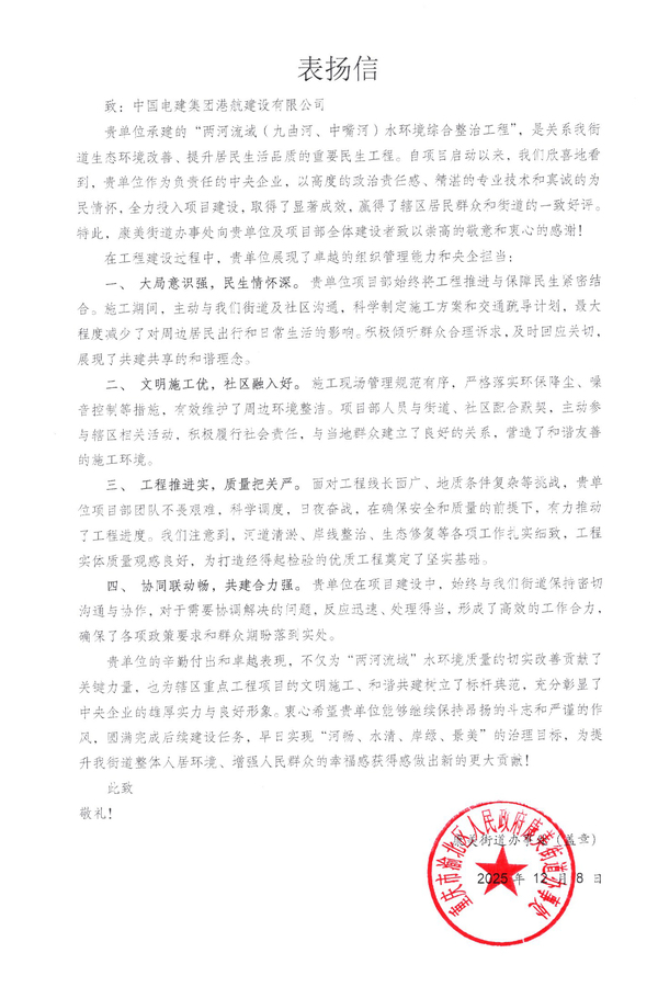 12月8日,公司承建的重庆两河流域(九曲河、中嘴河)水环境综合整治工程收到康美街道办事处发来的表扬信,信中对项目团队在工程建设中的优异表现予以充分肯定。